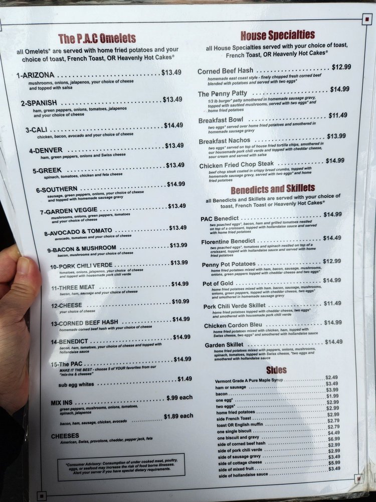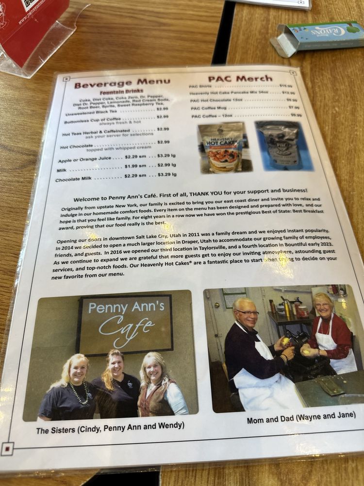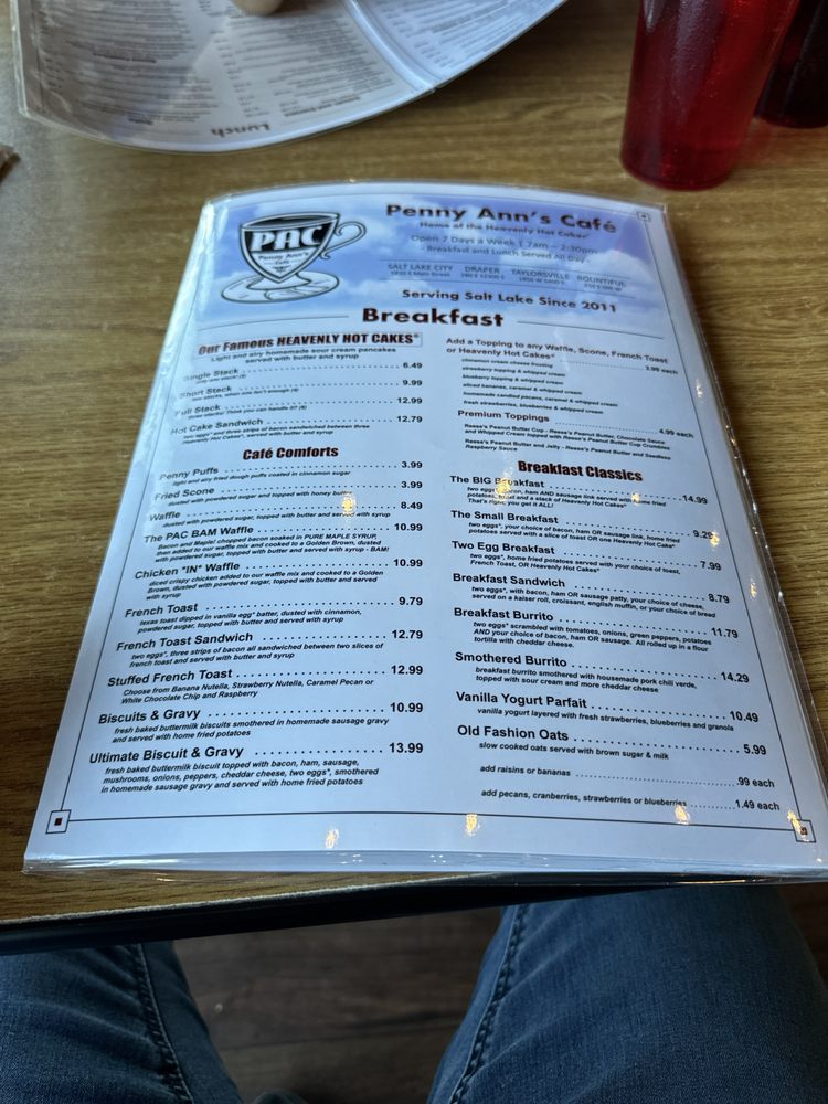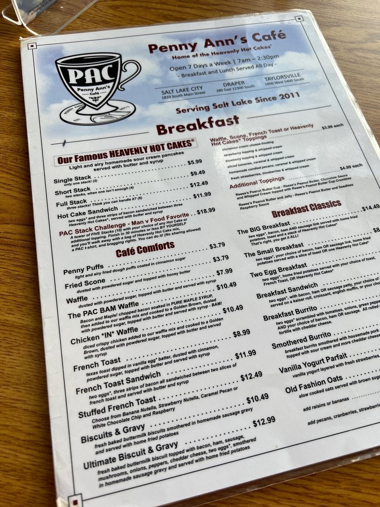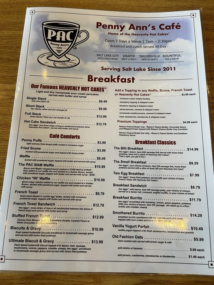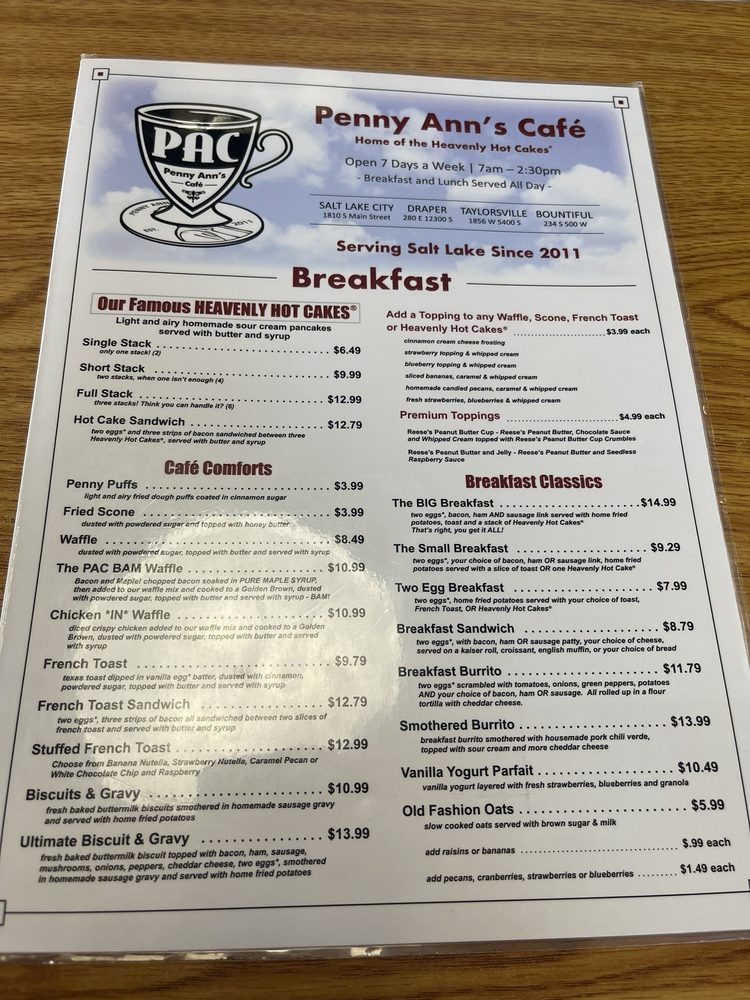 Introducing the menu at Penny Ann's Cafe, where you can indulge in a variety of breakfast and brunch favorites. Try our famous Heavenly Hot Cakes available in single, short, or full stacks, or go for the Hot Cake Sandwich for a savory twist. Other must-try dishes include the Pac Bam Waffle, Chicken in Waffle, and Stuffed French Toast options. Don't forget to add some delicious extras like Cinnamon Cream Cheese Frosting or Fresh Strawberries and Whipped Cream. The menu also features options for vegetarians, as well as happy hour specials, alcohol, and catering services. With a casual atmosphere and a range of amenities including outdoor seating, Wi-Fi, and waiter service, Penny Ann's Cafe is the perfect spot for groups, kids, and anyone looking for a satisfying meal. Don't miss out on the delightful flavors and welcoming ambiance at this charming cafe in Draper, UT.