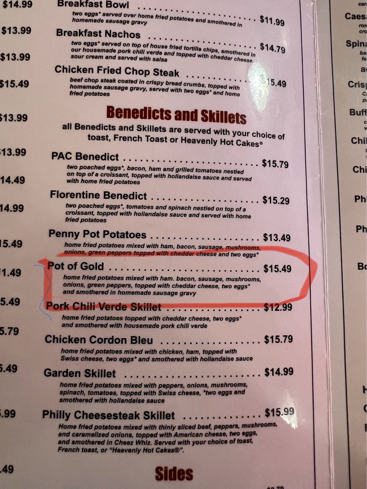 home fried potatoes mixed with ham, bacon, sausage, mushrooms, onions, green peppers, topped with cheddar cheese, two eggs*, smothered in sausage gravy and served with your choice of toast or "Heavenly Hot Cakes"